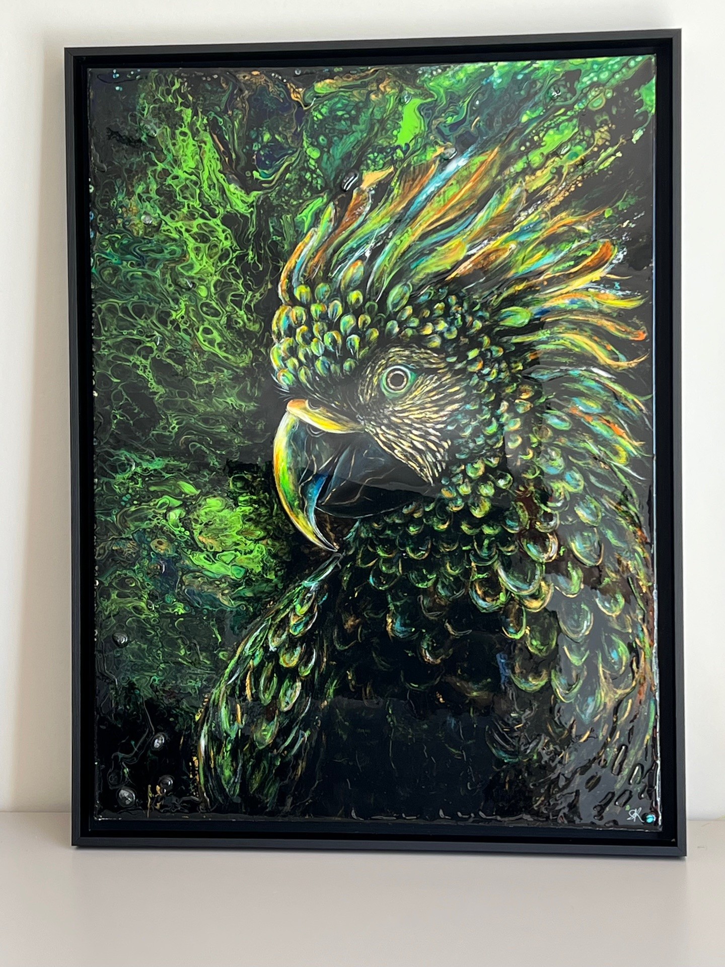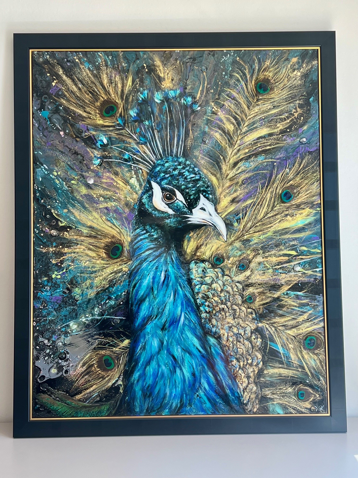 Incrustation de cristaux de roche et de vraies plumes et ocelles (oeil) de paon dans la résine.